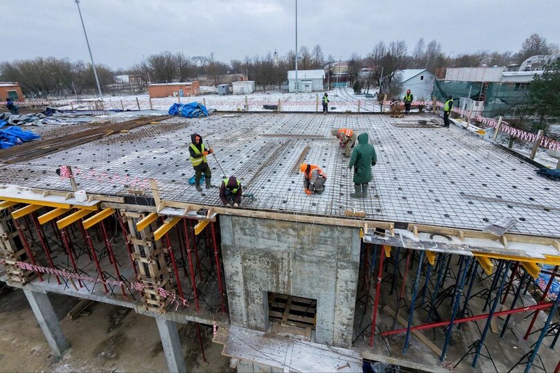 Ежедневно на площадке задействовано более 80 человек и 13 единиц техники. В настоящее время выполняются монолитные работы, монтаж инженерных сетей, демонтаж устаревших конструкций и устройство новых фундаментов.
