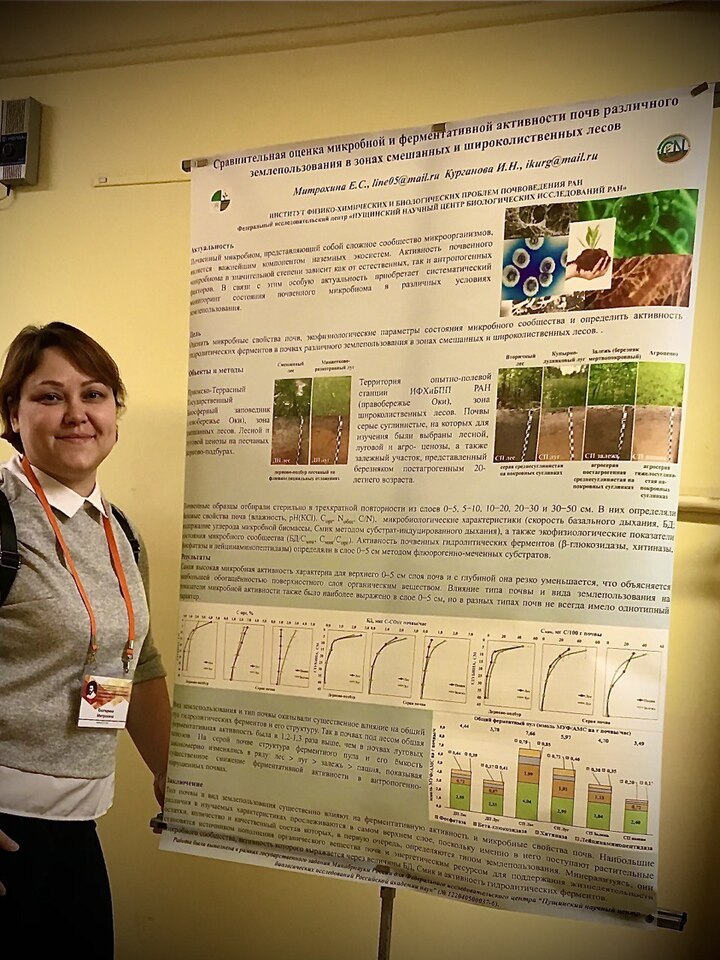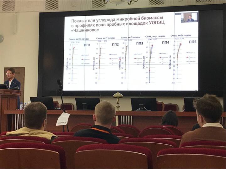 Молодые ученые института из молодежной лаборатории карбомониторинга, отдела криологии почв представили результаты своих исследований. Екатерина Митрохина из лаборатории почвенных циклов азота и углерода сравнила микробную и ферментативную активность почв в почвах различного землепользования в Серпуховском районе: от недавно заброшенных пашен до вторичных лесов. Ученые из лаборатории физико-химии почв и биогеохимических технологий рассказали о работах по отмывке песка от различных фракций нефти, а именно от топочного мазута, в связи с разливами на Черном море.