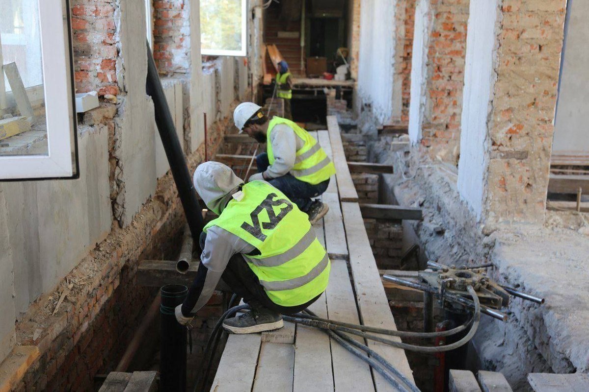 На строительной площадке задействовано 26 рабочих и две единицы техники, которые проводят устройство полов на втором этаже, монтаж систем отопления и вентиляции, укладку слаботочных трасс, а также электромонтажные работы. Строители уже приступили к фасадным работам и предчистовой отделке помещений, придавая зданию новый современный облик.