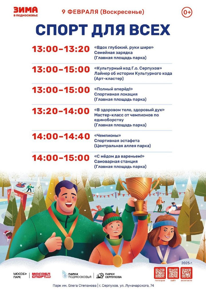Гости парков смогут принять участие в семейной зарядке, турнирах по зимним видам спорта, спортивных эстафетах, узнают историю Культурного кода Серпухова. На катке в «Питомнике» пройдут мастер-класс по фигурному катанию, показательные выступления фигуристов, хоккейная разминка. В парках будут организованы разнообразные спортивные интерактивные локации.