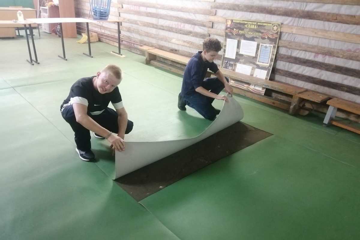 Ребята самостоятельно занимаются укладкой линолеума в стрелковой зоне, а также уборкой и покраской тира. Они с энтузиазмом приводят тир в порядок, расставляют инвентарь, проявляя неподдельный интерес к созданию комфортных условий для занятий.