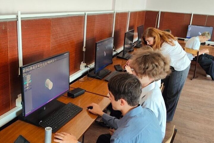 Школьники создавали 3D-модель детали «втулка» на компьютере в программе «Компас 3D». Ребята активно участвовали в процессе моделирования. Виктор Александрович продемонстрировал изготовление втулки на токарном ЧПУ симуляторе.