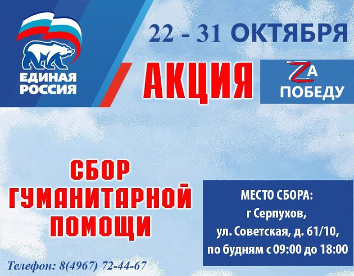 С 22 по 31 октября Местное отделение партии «Единая Россия» г.о. Серпухов совместно с Единым центром поддержки участников СВО и их семей проводит акцию «Zа Победу» по сбору гуманитарной помощи для участников специальной военной операции.