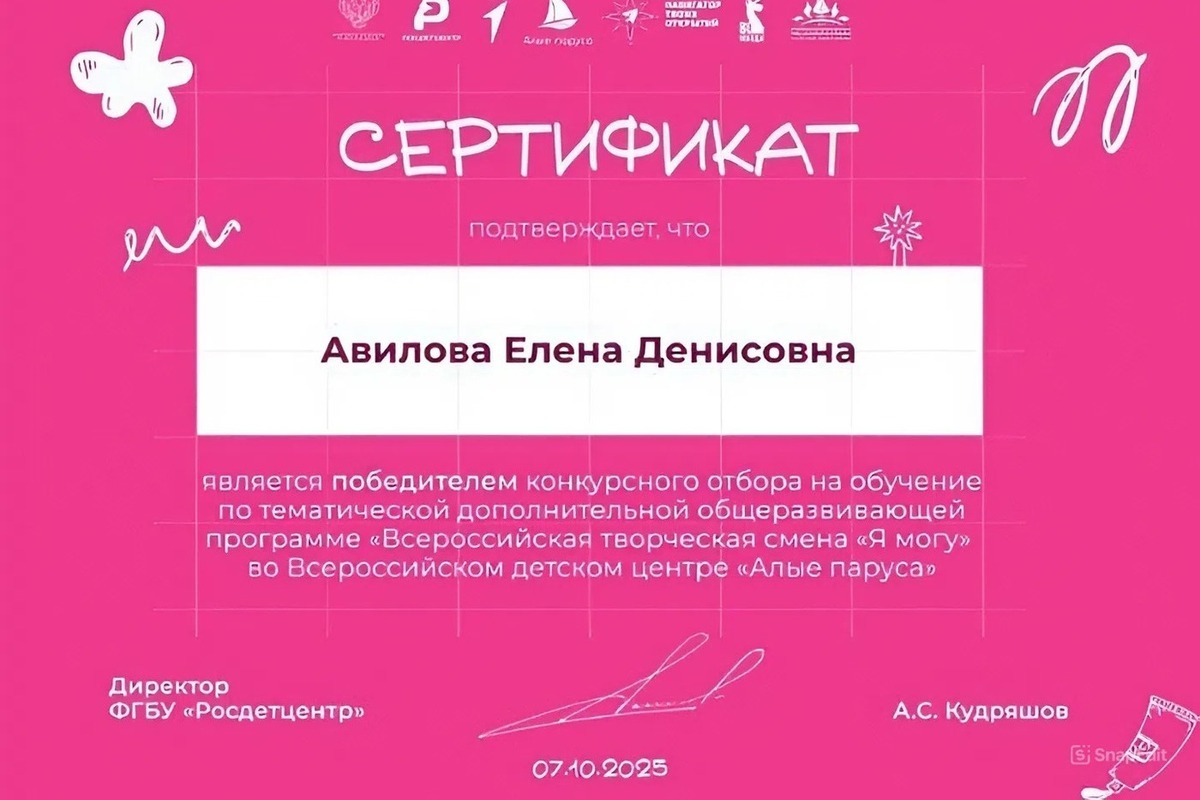 Стали известны итоги конкурсного отбора на обучение по тематической дополнительной общеразвивающей программе «Всероссийская творческая смена «Я могу» во Всероссийском детском центре «Алые паруса». В числе победителей – ученица из Городского округа Серпухов.