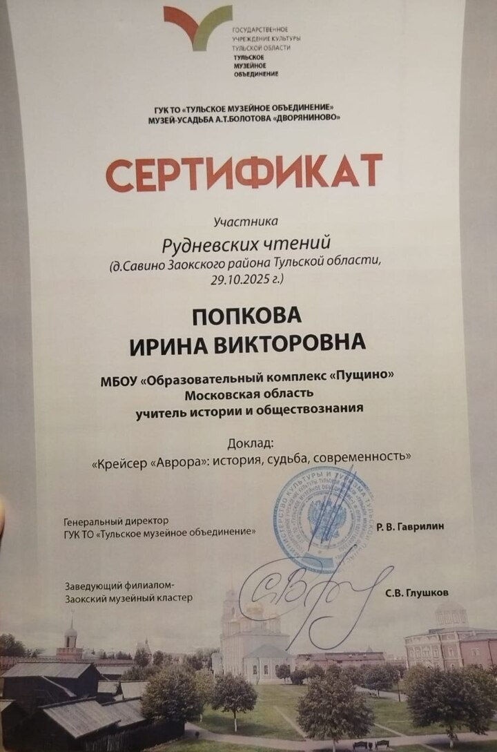Ирина Викторовна Попкова, учитель истории и обществознания из МБОУ «Образовательный комплекс «Пущино» выступила с докладом «Крейсер «Аврора»: история, судьба, современность», посвящённый 125-летию рождения легендарного корабля.