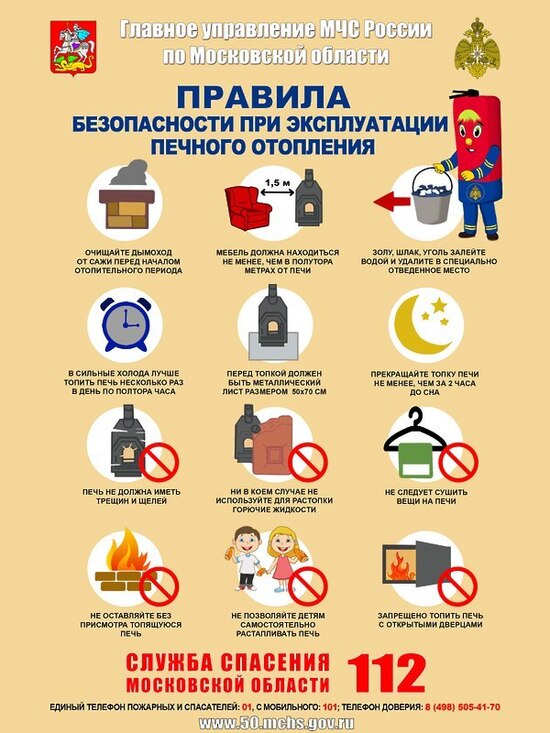 - перед началом отопительного сезона печи необходимо проверить и отремонтировать, дымоходы следует очистить от сажи и побелить. Неисправные печи, камины и дымоходы не должны допускаться к эксплуатации;