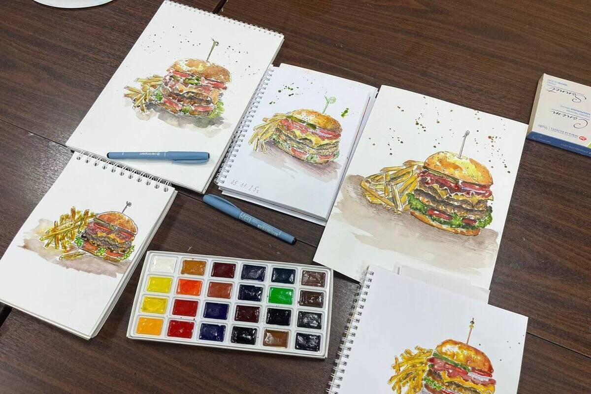 Под чутким руководством  художника-педагога Ольги Шмелевой участники погрузились в мир акварельной живописи. Их задачей было изобразить самый сочный и аппетитный бургер.