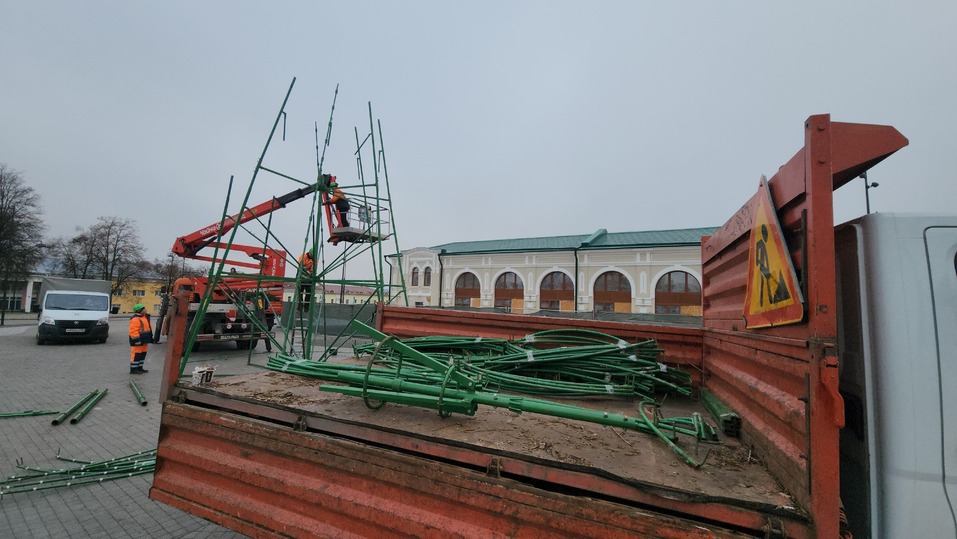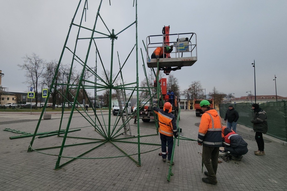 Для выполнения работ на площадь прибыли две грузопассажирские «Газели» с бригадой рабочих. По словам сотрудников комбината, монтаж конструкции займет два дня — в первый день установят каркас, во второй — украсят шарами, гирляндами и подключат к электричеству.