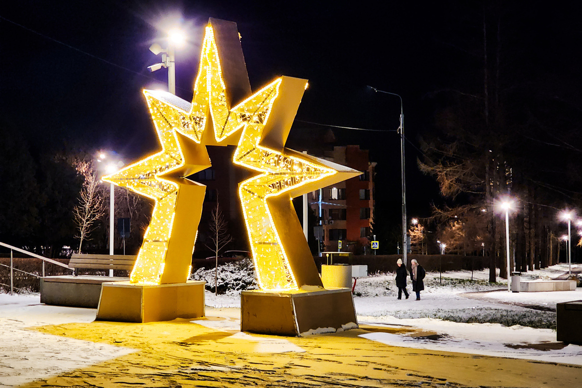Композиция высотой более двух метров украшена гирляндами, которые излучают тёплый золотистый свет. Она уже стала одной из любимых фотозон для горожан.