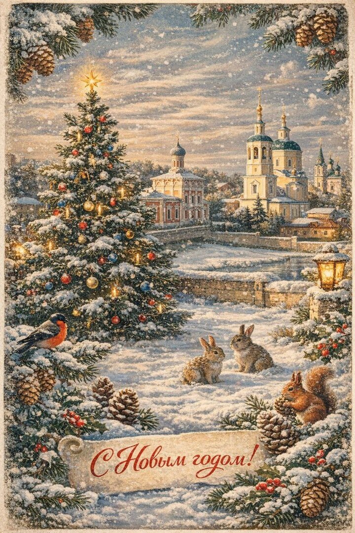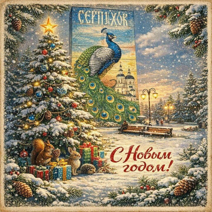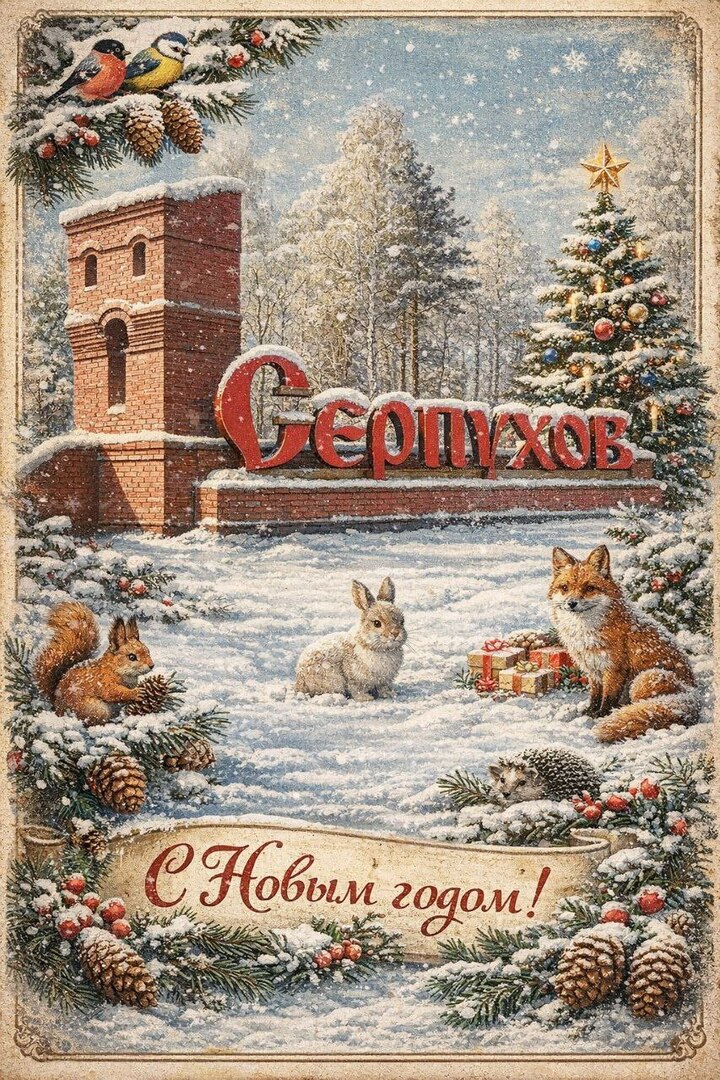 Как оригинально поздравить с Новым годом, особенно тех, кто ценит наш город? Вас ждёт специальная подборка — новогодние открытки и картинки на 2026 год с узнаваемыми видами Серпухова, стилизованными под ретро.