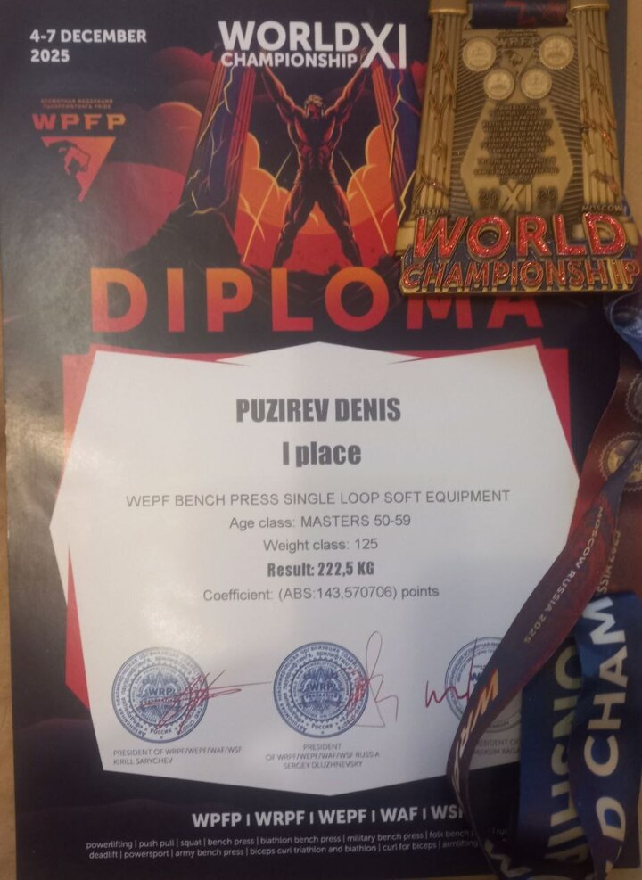 Дмитрий занял первое место в возрастной категории 50–59 лет и второе место в открытой категории, показав результат в 222,5 кг в одноповторном движении в софт-экипировке. Это достижение особенно значимо, учитывая, что всего три месяца назад спортсмен получил серьёзную травму — разрыв трицепса.